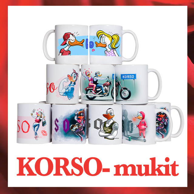 Kuvituksia on 7 eri aihetta ja KORSO ankat seikkailevat mukeissa, avaimenperissä ja lasinalusissa.